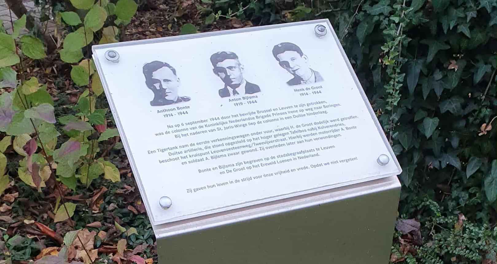 Na de ceremonie gingen we naar de plaats des onheils, in de vroege namiddag van 6 september 1944. Aan het kruispunt van de Leuvensesteenweg met de Tweevijverstraat viel de kolonne met de PIB op kop als recce in een Duitse hinderlaag. We gaven onze Nederlandse bezoekers de nodige tekst en uitleg rond de geschiedkundige feiten.